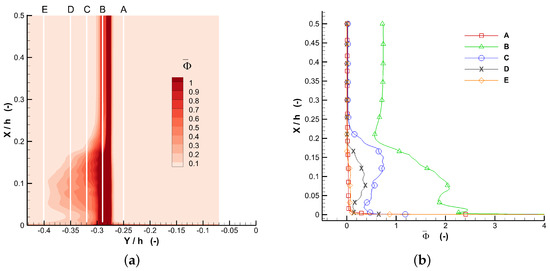 The distribution of the time-averaged dimensionless viscous entropy generation rate on the slice –. (a) Distribution of on the – slice; (b) One-dimensional distributions of along five spanwise lines.