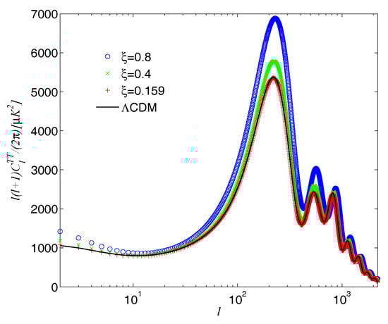 - Xu, L.; Wang, Y.; Noh, H. CMB Temperature and Matter Power Spectrum in a Decay Vacuum Dark Energy Model. Phys. Rev. D 2011, 84, 123004. [Google Scholar] [CrossRef]