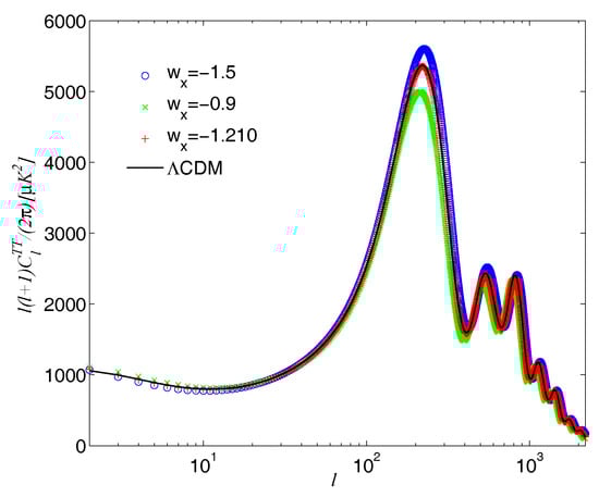 When the interaction between the dark sectors is considered, some cosmological effects could take place, so we try to look for theoretical predictions of CMB temperature power spectra. When the interaction rate is varied, the influences on the CMB temperature power spectra are presented in Figure 1. The different interaction rate changes the effective density parameter of dark matter which will alter the sound horizon. As a result, the first peak of CMB temperature power spectra is modified. At large scales , the integrated Sachs–Wolfe (ISW) effect is dominant, the changed parameter affects the CMB power spectra via ISW effect due to the evolution of gravitational potential. Meanwhile, we also show the cosmological effects of CMB power spectra for varied equations of state in Figure 2.