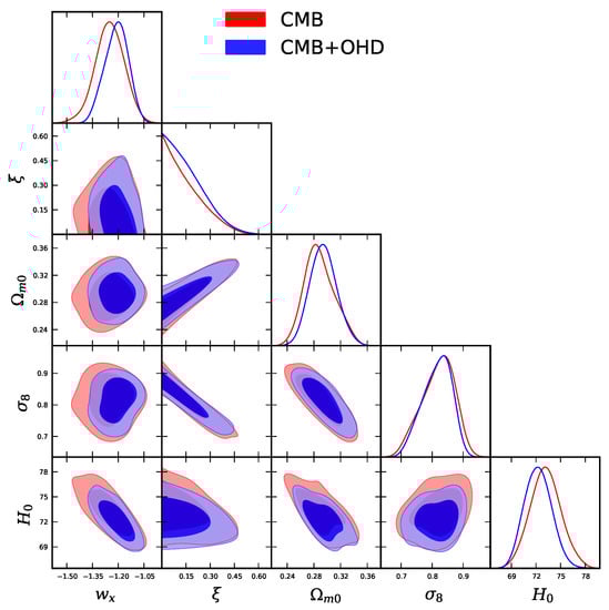 Firstly, we make an analysis of the constraint results. In Table 1, we have listed the global fitting results of the interacting dark energy model. The one-dimensional (1D) marginalized posterior distribution on individual parameters and 2D marginalized posterior distribution contours are shown in Figure 3. For the single constraint from the Planck 2015 CMB data, the testing results of interaction rate and equation of state are, respectively, and in region. For the joint constraint from Planck 2015 CMB and OHD, the results are and . The OHD simply provides a geometrical constraint for the background evolution of this interacting dark energy model. Concretely, from the background equations, we could calculate the numerical solution for the energy density of dark energy and dark matter at different redshifts. Under this situation, the pure geometrical measurement from OHD would provide weak constraint on the interacting dark energy model. This opinion could be seen from the Table 1. After adding the constraint from the observational Hubble data, the testing results have not been improved. The observational data sets, CMB and OHD, slightly favor a small interaction rate between dark energy and dark matter. Recent developments in model independent techniques of cosmic reconstruction seem to indicate that w is not smaller than −1 [,]. Meanwhile, from our constraint results of the interacting dark energy model, the mean value of the equation of state is less than −1 and it shows a phantom phrase, which might be because of our choice of interaction form with the equation of state factor ().