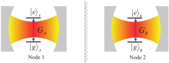 where is the transition frequency between the high level and the low level of the qubit x (). and are the general Pauli matrices of the qubit x. (a) and (b) are the creation (annihilation) operators for two single-mode fields with angular frequency , respectively. is the coupling strength between the qubit x and its localized field, and is the conjugate complex of . The assumption , referred to as two nonidentical qubit-field coupling constants, represents a clear distinction from two standard Jaynes–Cummings nodes with [72], which has been predicted to exhibit the exponential decay of two-qubit entanglement and its revival timing and duration by an approximately analytic formula when the fields are nearly classical. For simplicity, we further assume that there is not any interaction between two qubits or two fields and the qubit resonantly couples to its localized field, i.e., , as illustrated in Figure 1.