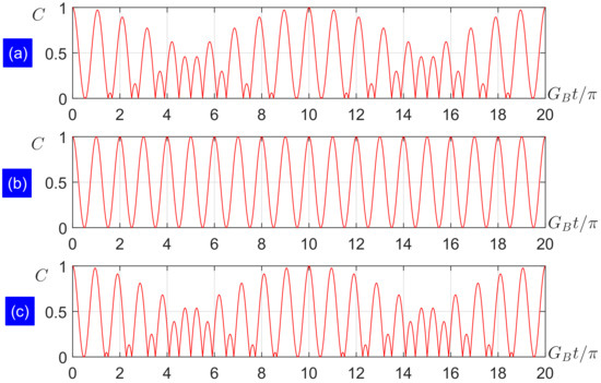 Time-dependent evolution of C for: (a) ; (b) ; and (c) . The corresponding periods are , , and , respectively.