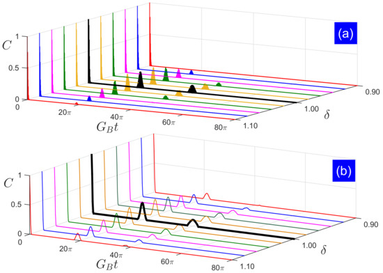 This concurrence evolution of two Jaynes–Cummings nodes reduces to that of two identical standard Jaynes–Cummings nodes at both the decay exponent and revival period. In Figure 3, we plot the long-time system dynamics under the coherent states with the large average photon number for analytical and numerical calculations. We find that the two-qubit entanglement exhibits sudden death phenomenon, and its peaks are not fully revived and decrease quadraticly as the gap between two qubit-field coupling strengths enlarges. The two-qubit entanglement decays exponentially as the evolution time increases. When , the revival period is linearly shifted to the “left” side, i.e., becoming shorter; while when , it is linearly shifted to the “right” side, i.e., becoming longer. Note that the numerical results in Figure 3b are not perfectly predicted by the analytical results in Figure 3a, and their main difference is the absence of Rabi-type oscillations during the revivals, i.e., the disappearance of tiny revivals in numerical results, which is not predicted by this analytical method [72]. Therefore, it is safe to say that the analytical results predict the numerical results for small gaps between two qubit-field coupling strengths in both the entanglement revival peek and period. Our result is physically important because the formula reveals analytically the relation between the entanglement evolution dynamics and two nonidentical qubit-field coupling strengths, which further clarifies the mechanism of entanglement sudden death and rebirth and provides another effective direction for entanglement control.
