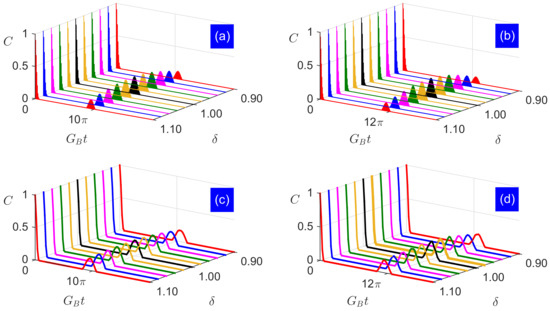 in which and . Since the qubit-field coupling strengths are nonidentical in the infinite-dimension Hilbert space, the analytical two-qubit entanglement C is hard to obtain under a general condition. However, it is highly desirable to get analytical results for understanding the entanglement’s fundamental physics. In the following, we use the analytical formula of saddle point method [72] to tackle the entanglement dynamics of Equation (13) when the coherent states are both highly excited (nearly classical).