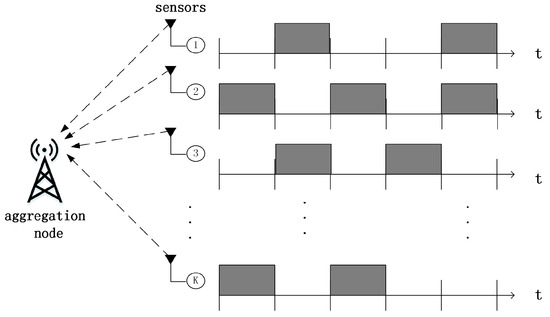 IoT uplink scenario with K sensors sporadically transmitting frames to an aggregation node.