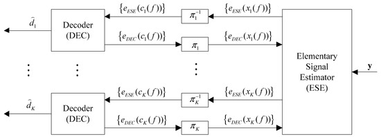 The CBC-MUD scheme contains mainly two parts: an elementary signal estimator (ESE) and K single-user a posteriori probability (APP) decoders (DECs). In the whole turbo iterative process, the ESE and the DECs generate logarithmic likelihood ratios (LLRs) of as extrinsic information, which is defined in Equation (2), for interchange: