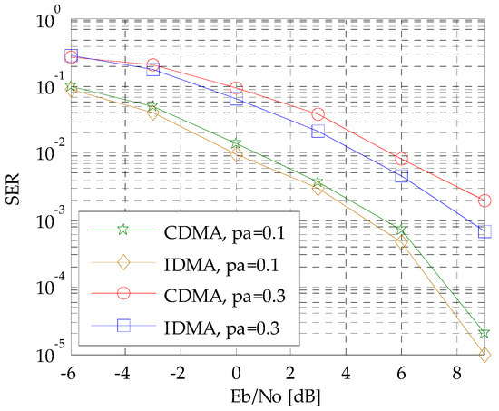 As discussed in Section 3.1.2, the properties of system matrix A will vary for different multiple access technologies, and further distinguish the symbol error rate (SER) performance of multi-user detection based on CS. For fair comparison, we adopt the GOMP algorithm to implement MUD for both multiple access system. Figure 5 shows the SER performance comparison between IDMA and CDMA system, with two active probabilities setting, i.e., pa = 0.1 and pa = 0.3.