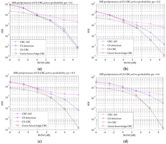 SER performance with different Eb/N0. (a) pa = 0.1; (b) pa = 0.2; (c) pa = 0.3; and (d) pa = 0.4.