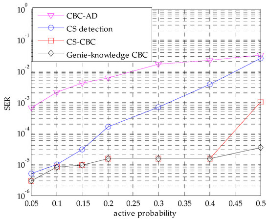 Figure 6 compares the SER performance of the following four detectors: CBC-AD, CS detection, the proposed CS-CBC, and Genie-knowledge CBC. Herein, the Genie-knowledge CBC algorithm plays a lower bound. Figure 6 demonstrates that CBC-AD is superior to CS detection and CS-CBC algorithm under low Eb/N0 and the SER performance gap is more pronounced with increasing active probability. The CBC-AD takes the advantage of full frame activity knowledge, which results in a good performance in a high noise levels due the averaging. Two obvious characteristics should be noted when Eb/N0 increases: on one hand, due to the high correlation of the interleaves in overloaded system, the performance of the CBC-AD quickly hits an error floor; on the other hand, CS-CBC is superior to CS detection and CBC-AD and their gaps become larger with higher Eb/N0. Furthermore, it is close to the performance of Genie-knowledge CBC under high Eb/N0. Thanks to the reliable performance of CS detection, CS-CBC has perfect knowledge of active sensors to position non-zero items, and makes data recovery better than CS detection.