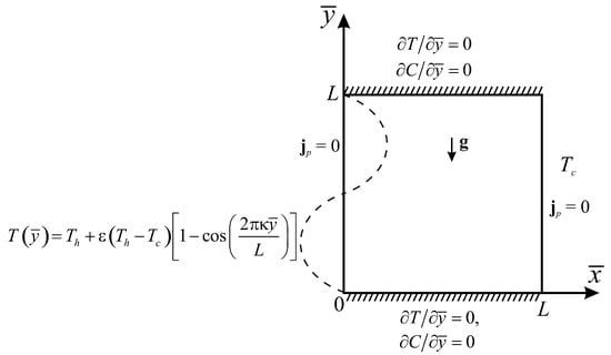 We consider the natural convective fluid flow and heat transfer within a square cavity filled with a nanofluid based on water and solid nanoparticles. A schematic geometry of the problem under consideration is shown in Figure 1 with dimensional Cartesian coordinates, where L is the size of the cavity. The cavity has adiabatic horizontal walls and the right vertical wall is kept at a constant temperature Tc. The left vertical wall have variable temperature distribution according to the vertical coordinate as follows: