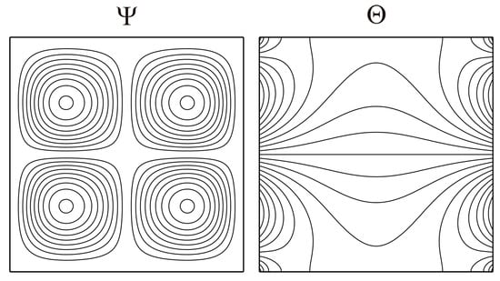 Cooling is one of the most important technical challenges facing many diverse industries, including microelectronics, transportation, solid-state lighting, and manufacturing. The review paper by Manca et al. [] notices that the heat transfer can be enhanced by increasing the thermal conductivity of the fluid. This is possible by adding small size metallic or oxyde-metallic particles to the base fluid. When the size of added particles is in the range of nanometers, the so called nanofluid is obtained and it was shown that this fluid posses enhanced thermal properties. (see Choi []). It is worth mentioning that many references on nanofluids can be found in the books by Das et al. [], Nield and Bejan [], and Shenoy et al. [], and in the review papers by Buongiorno [], Buongiorno et al. [] and Mahian et al. [], etc. Several published papers, such as those by Sivasankaran and Pan [], Alsabery et al. [,], and Oztop et al. [] have considered the natural convection in cavities filled by nanofluids where the temperature on the boundaries is non-uniform, having a sinusoidal distribution.