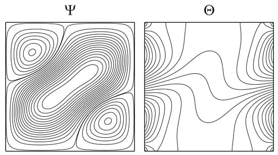 Obtained streamlines Ψ and isotherms Θ at Ra = 105 and phase deviation ϕ = π/2.