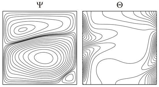 The unsteady partial differential Equations (12)–(15) with corresponding boundary conditions (16) were solved using the finite difference method (see Shenoy et al. [], Sheremet and Pop [,], Sheremet et al. [,]). The solution of these equations is marched in time until the steady-state flow is obtained. The convective and diffusive terms are approximated by the second-order discretizations. The transient equations were solved on the basis of Samarskii locally one-dimensional scheme. The linear discretized equations were solved by Thomas algorithm. The Poisson equation for the stream function was discretized by means of the five-point difference scheme on the basis of central differences for the second derivatives. The obtained linear discretized equation was solved by the successive over relaxation method. Optimum value of the relaxation parameter was chosen on the basis of computing experiments. The computation is finished when the residuals for the stream function get below 10−7.