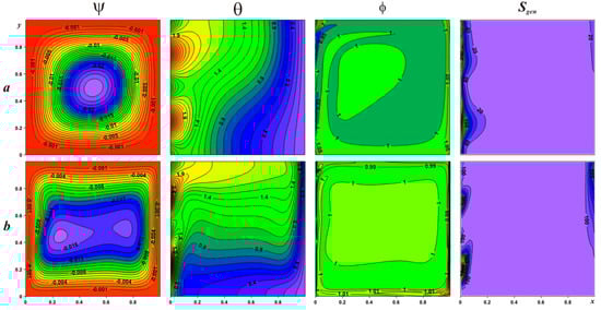 Streamlines ψ, isotherms θ, nanoparticles volume fraction φ and total entropy generation Sgen for ε = 1.0, κ = 2.0: (a) Ra = 103, (b) Ra = 105.