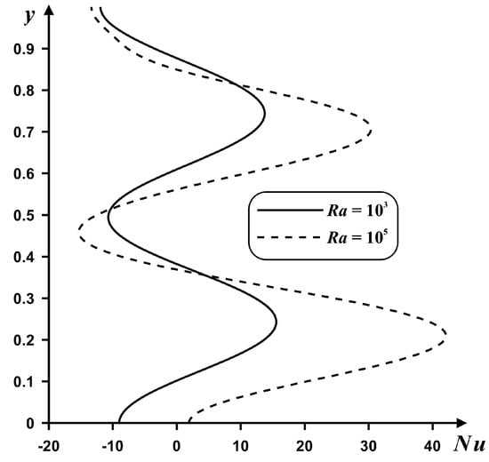 Figure 6 shows profiles of local Nusselt number along the left vertical wall for different values of the Rayleigh number. Regardless of the Rayleigh number value, two local maxima of Nu are along the wall in the heated zones. An increase in Ra leads to significant growth of Nu in these heated zones. At the same time, location of maxima goes weakly along the negative y-coordinate. It should be noted, that bottom local maximum is a global maximum due to an interaction of hot flow from the left heated zone and cold flow from the right cooled wall.