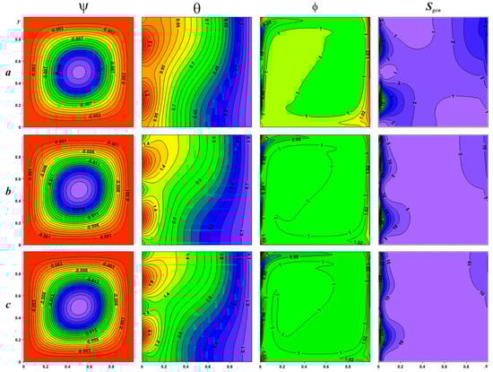 An increase in the Rayleigh number (Figure 5b) leads to a formation of a convective cell with two cores similar to the case of the clear fluid (Vahl Davis []) but here these cores are displaced due to the additional effects of Brownian diffusion and thermophoresis. The distribution of the temperature reflects the formation of a stratified zone in the central part of the cavity. Intensified convective flow and heat transfer illustrate non-uniform temperature distribution in heated zones along the left vertical wall. Distribution of nanoparticles is more uniform in comparison with the case of Ra = 103. At the same time, Sgen increases significantly along the vertical walls due to intensification of the convective flow and as a result a growth of temperature gradient appears.