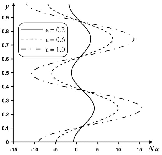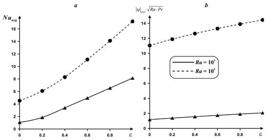 Profiles of local Nusselt number along the left vertical wall are shown in Figure 8. An increase in ε leads to a growth of local maxima and minima of Nu, as a result, average Nusselt number at this wall is an increasing function of ε (see Figure 9a). At the same time, a rise of Rayleigh number also leads to a growth of average Nusselt number. It is worth noting that an increase in Nuavg with ε is more significant for high values of Rayleigh number. One can find also that fluid flow rate is an increasing function of wall temperature amplitude and Rayleigh number. Intensity of convective flow raises more significant for high values of Rayleigh number (see Figure 9b).