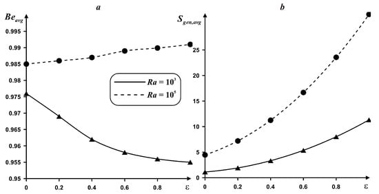 The effects of Ra and ε on average Bejan number and average entropy generation are presented in Figure 10. Average entropy generation is an increasing function of Ra and ε, while Beavg decreases with ε for low value of Rayleigh number (Ra = 103) and increases with ε for high value of Rayleigh number (Ra = 105). Such behavior has been mentioned above, where high values of Ra reflect more intensive convective flow and heat transfer with high values of temperature gradient. The behavior of average entropy generation is similar to average Nusselt number in the case of more significant growth for high Ra.