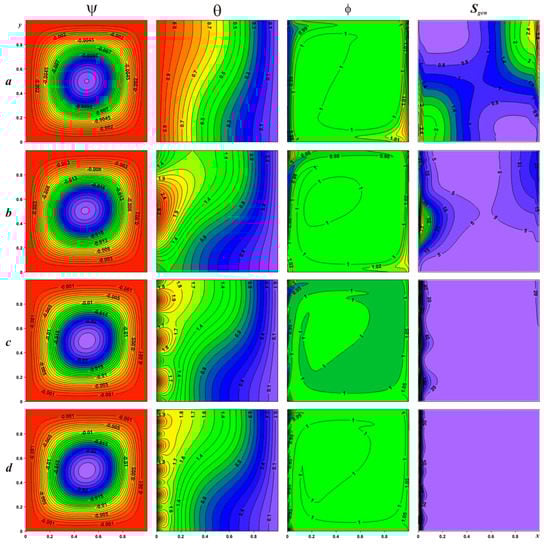 Streamlines ψ, isotherms θ, nanoparticles volume fraction φ and total entropy generation Sgen for Ra = 103, ε = 1.0: (a) κ = 0.0, (b) κ = 1.0, (c) κ = 3.0, (d) κ = 5.0.