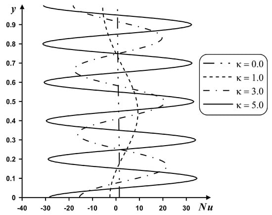 Profiles of local Nusselt number for different values of wave number are shown in Figure 12. An increase in κ leads not only to a rise of number of local maximum but also to a growth of amplitude of local Nusselt number. As a result, we have a significant increase in average Nusselt number at the left vertical wall (see Figure 13a). Nanofluid flow rate increases also with κ, but for κ > 3 in considered range of Rayleigh number, the fluid flow rate is near constant. Local maximum in is formed at greater value of wave number with a growth of Rayleigh number.