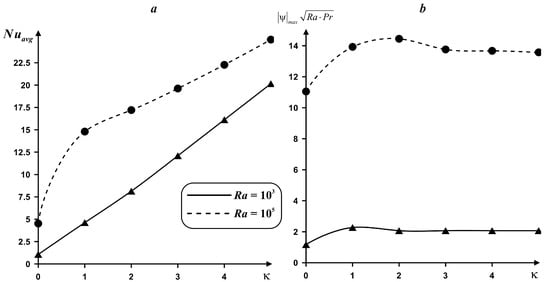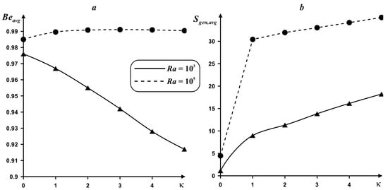 Behavior of the average Bejan number and the average entropy generation shown in Figure 14 is similar to behavior presented in Figure 10. It should be noted that low Rayleigh number (Ra = 103) illustrates a decrease in average Bejan number with wave number due to a reduction of the heat transfer irreversibility for low intesive flow and heat transfer in comaprison with fluid friction irreversibility and mass transfer irreversibility. At the same time, the average entropy generation significantly increases with transition between constant temperature (κ = 0) and variable temperature distribution (κ = 1) for Ra = 105 due to intesification of convective flow. Average Bejan number for high Rayleigh number characterizes a weak changes owing to significant role of heat transfer irreversibility.