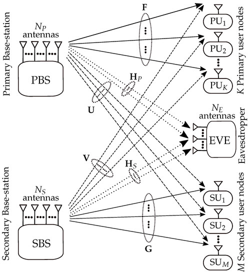 Let be the channel matrix between the PBS and PUs, and is the channel matrix between the SBS and SUs. Here, and are the interference channel matrices between the SBS and PUs and between the PBS and SUs, respectively. Moreover, is the channel matrix between the PBS and the eavesdropper, and is the channel matrix between the SBS and the eavesdropper. For the sake of the brevity of exposition, all the aforementioned channels can be correspondingly defined in the following general expression:
