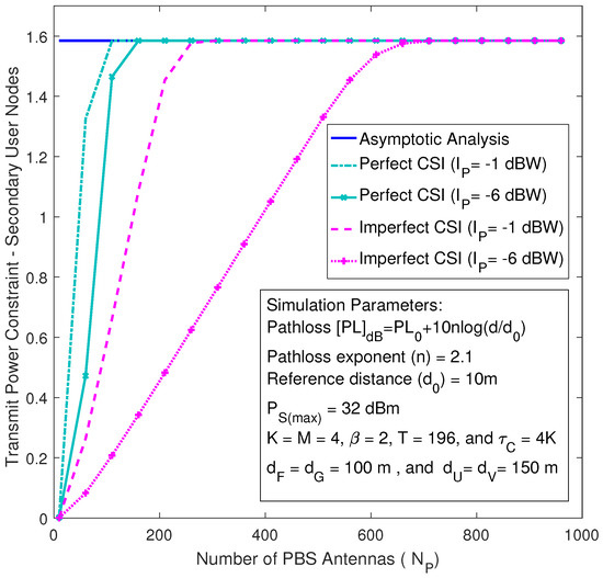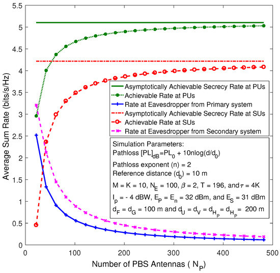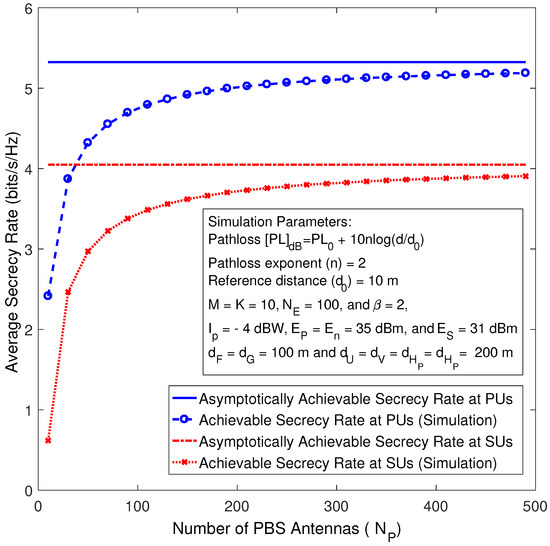 Figure 5 depicts the achievable secrecy rate of the primary and secondary systems against the number of PBS antennas for the perfect CSI case. The asymptotic secrecy rate curves are plotted by using (52) and (53), whereas the exact sum rate curves are plotted by using Monte-Carlo simulations. As shown in Figure 5, for a fixed number of antennas at the eavesdropper (), the achievable secrecy rates at the primary and secondary systems go up gradually with the growing of and until they approach their corresponding asymptotic curves, which basically means the capability of the eavesdropper decreases and eventually vanishes whenever the number of antennas grows large.
