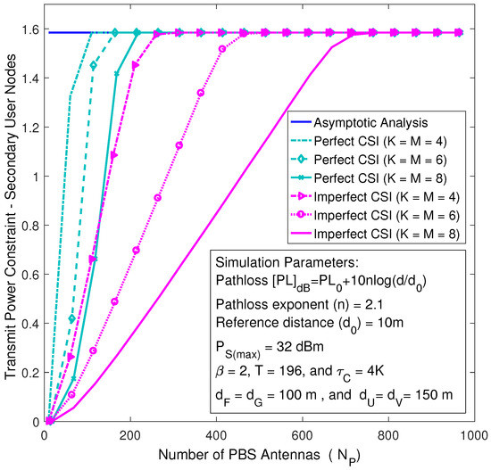 In Figure 4, the transmit power constraint at the secondary system is plotted versus the number of PBS antennas by varying the number of user nodes for the cases of imperfect and perfect CSI. Figure 4 shows that the secondary system transmit power asymptotically approaches its peak level as the number of PBS antennas grows without bound, irrespective of the number of user nodes. Nevertheless, the rate of asymptotic convergence decreases when the numbers of user nodes increase. Therefore, the secondary system can asymptotically be operated at its peak transmit power, regardless of the number of user nodes and primary interference temperature, whenever the PBS is equipped with a very large antenna array.