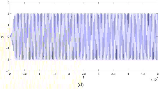 Firstly, we investigate the effect of time delay on the amplitude of the economy system. We set and , then system (29) is a deterministic system. From Figure 1, we can obtain that the fractional time delay can change the stability of the fixed point. When in Figure 1a,c, the fixed point is asymptotical stability. When in Figure 1b,d, a limit cycle can be obtained. In other words, when the effect of fractional time delay exists, the economy system will still have periodic fluctuations even it is under economic control. It means that the economic control is ineffective. So, the policy maker must consider this when making economic control.