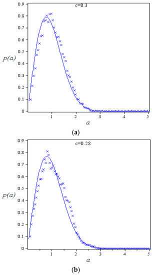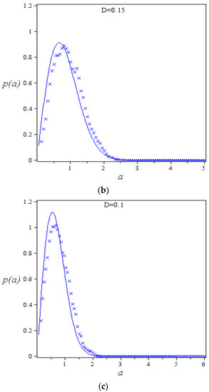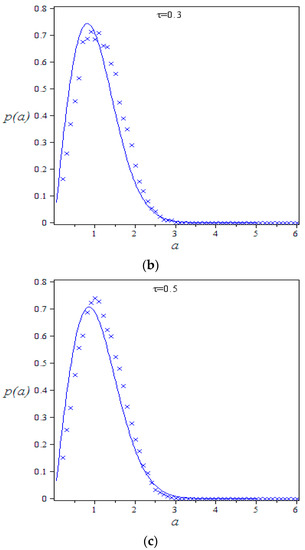 The solid line “-” is analytical solutions, the crosses “x” are numerical solutions; , , , ; (a) Stationary probability density function: ; (b) Stationary probability density function: ; (c) Stationary probability density function: .