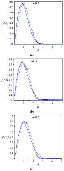 In this section, we study the effect of fractional order on the amplitude of the economy system (28). Figure 3 is the stationary probability density of amplitude for different values of fractional order. From Figure 3, we can obtain that the peak is decreasing with the decrease of the fractional-order derivative. In other words, with the increase of the fractional-order derivative, the stability of the economy system is magnified. The smaller fractional-order derivative represents the stronger memory effect of economic control. This means that the memory property can lower the stability of the economy system. On the other hand, the smaller fractional-order derivative has a bigger amplitude on its peak of stationary probability density function. This means that the memory property of economic control can magnify the amplitude of the economy system. This indicates that the memory property of economic control actually plays a negative role in making the economy system under control, and we can compute the effect of memory property by Equation (31). So the policy maker can make effective economic policy to make the economy under control.