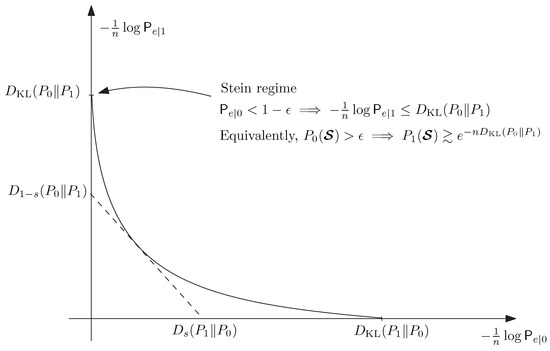 which explains the endpoints of the curve in Figure 2. In particular (though some technicalities would be needed for a rigorous derivation), the quantity governs the “Stein regime”; if in the binary hypothesis test is only required to be bounded away from 1 as , then is asymptotically upper-bounded by . This can be stated equivalently as saying that regions for which satisfy .