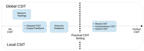 Channel state information (CSI) refers to the knowledge of channel properties of a wireless network. We differentiate between channel state information at the transmitter and at the receiver (CSIT and CSIR). CSIT and CSIR specify at which nodes (source or destination) CSI is available. Particularly, in most practical applications, it is more challenging to obtain accurate CSIT than CSIR [24]. Thus, in the latter we will restrict our focus on the quality of CSIT assuming the availability of perfect CSIR. Channel properties as part of CSIT may include but are not limited to channel coefficients in various forms (instantaneous, delayed, etc.), network topology, output feedback, etc. In the remainder of this section, we will explain various channel properties in greater depth in a specific order. That is, we aim to categorize CSIT qualitatively from high to low fidelity. Figure 1 intends to order the CSIT qualitatively.