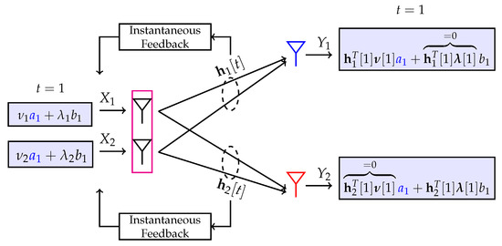 where a and b are private information symbols intended for Rx-1 and Rx-2, respectively, where is a common symbol. The intuition behind the choice of Equation (34) is as follows: