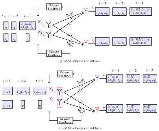 The MAT scheme of the MISO broadcast channel with two transmit antennas under delayed CSIT in two variants (a,b) requires three channel uses . The main difference between the MAT scheme and zero-forcing beamforming shown in Figure 2 is that interference cannot be canceled instantaneously due to lack of current CSIT. Instead, in the MAT scheme interferences (for instance ) function as side information at the receivers. When these interferences are reconstructed through means of delayed CSIT they allow one receiver to retrospectively cancel interference while providing the other receiver with useful information on its desired symbols.