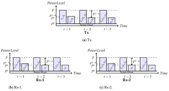 Hereby, step follows by assuming that the CSIT quality parameters (cf. Equation (11)) are identical for all channels in . Thus, the power level of symbols that are (partially) zero-forced ( at Rx-1 and at Rx-2) reduces by (cf. Figure 5a vs. Figure 5b,c). For instance, symbol is transmitted in channel use at the highest transmit power level P (see Figure 5a) and is received at the intended receiver Rx-2 without any change in power while it is partially zero-forced to a power level at the unintended receiver Rx-1 as illustrated in Figure 5b,c for . On the other hand, when conveying symbols and in channel uses and , a lower transmit power is allocated to each symbol, that is only (cf. Figure 5a for and ), such that these symbols are zero-forced at Rx-1 to the noise power level of ; thus, being completely negligible in DoF sense. Due to symmetry, the same observation holds true for symbols and with the slight difference that the roles of the receivers swap. Symbols and , on the other hand, are not precoded which is why their power levels do not change at either receiver and remain at . Now, we move to the MAT part of this scheme. At time instant , two precoded symbols of high power P () and two symbols of lower power () are sent to the receivers. Thus, the receivers observations become: