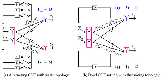 in aforementioned equation. We recall that through this modified model, the power constraint at the transmitter is bounded by unity where effective channel coefficients of Rx-1 and Rx-2 now become and , respectively. Importantly, the large-scale fading effect of these coefficients (), are time-varying; thus, making the topology of the MISO BC fluctuating in signal strength. In addition, to capture alternating CSIT, we define indicator variables to denote which one of the CSIT states or N for time t, Rx-1 and Rx-2 feed back to the transmitter. For instance, Figure 7a illustrates the system model for state . When considering an entire transmission interval spanning multiple channel uses, the transmitters are interested in knowing the fraction of the transmission time (a) during which the CSIT state is given by any pair [9] and (b) during which the topology state is given by any pair [62,63]. Thus, effectively, and correspond to two-dimensional probability mass functions that depend on the pair of random variables and , respectively [64]. In the sequel, we characterize how the achievable GDoF is affected when CSIT is available according to: