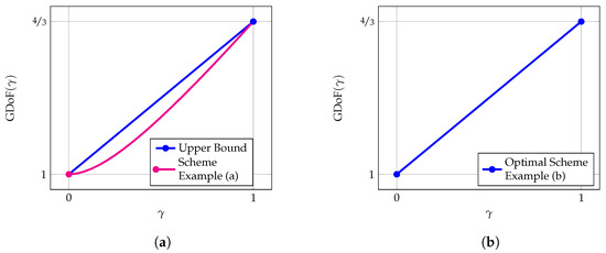 In this sub-section, we will analyze the effect of CSIT on the (G)DoF through examples of the D-user multiple-input single-output (MISO) Gaussian broadcast channel (BC) that consists of S antennas, where . This is a special case of the channel model from Section 2 for S cooperating transmitters, relays and D destinations. For this particular channel, the DoF is known for specific instances of CSIT. In case of perfect CSIT, the DoF is [37,38], while for delayed CSIT the DoF of the MISO BC when corresponds to [11]. In case of mixed CSIT, is the optimal DoF of the two-user MISO BC () [27,28]. DoF-optimality for the alternating CSIT setting on the two-user MISO BC has been established in [9].