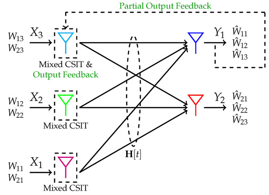 - Kakar, J.; Awan, Z.H.; Sezgin, A. Achieving the optimal DoF with feedback and mixed CSIT for the 3x2 X-channel. In Proceedings of the International Symposium on Wireless Communication Systems (ISWCS), Poznan, Poland, 20–23 September 2016; pp. 131–135. [Google Scholar]