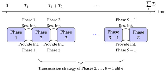 We now highlight the main aspect of the coding scheme that is applicable to examples (a) and (b). Generally, the scheme is composed of B communication blocks in a block-Markov fashion [65,66], where the length of every block is restricted to a finite, constant number of channel uses. In all blocks , we convey the receivers with private and common information. To be more precise, in every block ℓ newly encoded information symbols are transmitted as private information, while residual interference (observed at the receivers in the previous block are locally constructed through the transmitter’s access to delayed CSIT, quantized and finally) is transmitted as common symbols to the receivers. In the last block, however, the transmitter sends only common symbols to Rx-1 and Rx-2. At the receivers, the decoding starts from the last block and moves backward. Specifically, common information of the ℓ-th block is used to decode both private and common symbols of the ()-th block.