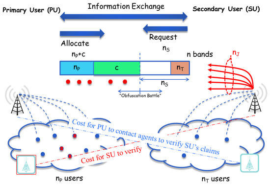 In the first step of the game, to establish the tradeoff between communication reliability and the cost of obfuscation associated with increasing communication reliability, we assume the number of bands (decoys) c, reserved for increasing the domain of uncertainty, is fixed. Without loss of generality we can assume that bands [ 1 , n P + c ] are reserved for the PU, and the SU knows these bands. The PU has to support reliable communication with n P users. The actual band assigned to each such user is fixed and known only to the PU. Without loss of generality we can assume that the bands for these n P users are allocated within the bands [ 1 , n n T ] , and there is no way for the SU to ascertain whether an announced channel will be used or whether it will be a decoy channel. Further, we suppose that the SU is malicious and could try to interfere with the PU’s communication by using a jamming capacity of n A signals, where each interference signal can reside in only a single band.