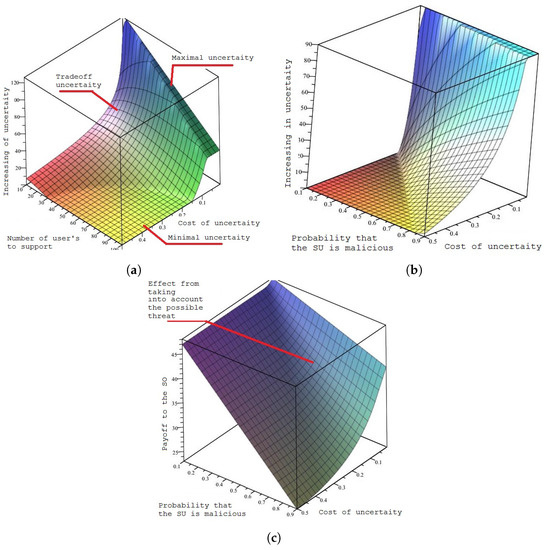 Figure 5a,b illustrates the probability of believing in the request for two bands a ( 2 , B ) and the probability for requesting two bands, if only one legitimate communication has to be supported, i.e., b ( 1 , 2 ) , as functions of the number of bands n and the probability that the malicious SU is of type- ( 1 , 1 ) with scenario parameters: C P = 0 . 005 , C S = 0 . 7 , n A = 10 , n P = 30 , α = 0 . 5 , q 01 = 0 . 1 , q 02 = 0 . 3 and q 11 + q 12 = 0 . 6 . Figure 5c illustrates how taking into account information about the nature of the SU can improve the SO’s payoff. Also, it is very interesting to note that the optimal strategy for the SO, as well as its payoff, are discontinuous in the information describing the SU.