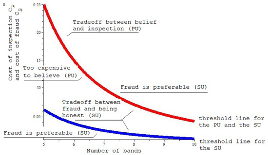 Thus, we have shown in Proposition 3 that the game has either a pooling or a mixed equilibrium. The pooling equilibrium assumes that all the malicious SU types request the same number of bands. In our particular case this corresponds to two bands. In the pooling equilibrium the SO learns nothing from the SU’s request.