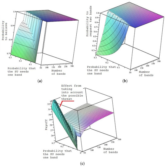 Figure 5. (a) Probability of believing in the request of two bands, a ( 2 , B ) ; (b) probability of requesting two bands, if only one connection has to be supported, b ( 1 , 2 ) ; and (c) the payoff to the SO as functions of the number of bands n and the probability that the malicious SU is of type- ( 1 , 1 ) .