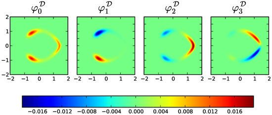 We choose parameters and in the following numerical experiment. In fact, for this two-dimensional problem, it is possible to directly solve the eigenproblem (5) by discretizing the operator . First of all, we note that the generator can be written as . Defining the operator such that for a function f, it is straightforward to see that the operator has the same eigenvalues as and the corresponding eigenfunctions are given by , where are the eigenfunctions of . Furthermore, is a self-adjoint operator under the standard inner product. Instead of , we will work with and solve the eigenproblem because the discretized matrix will be symmetric and the corresponding eigenfunctions decay rapidly.