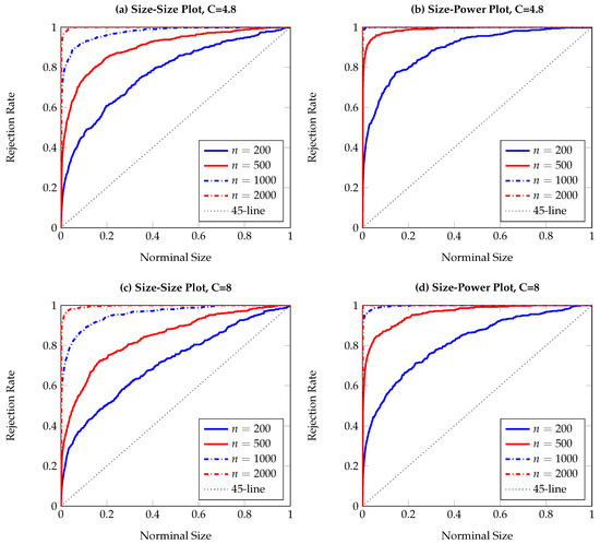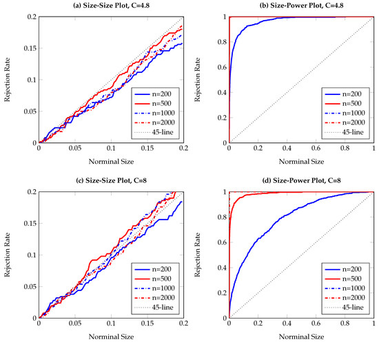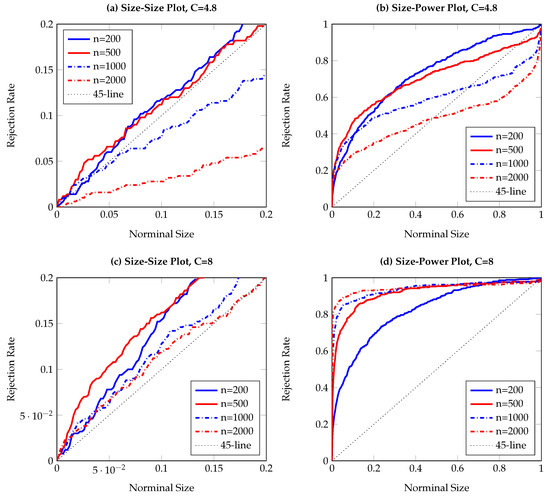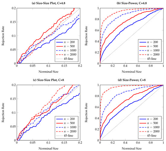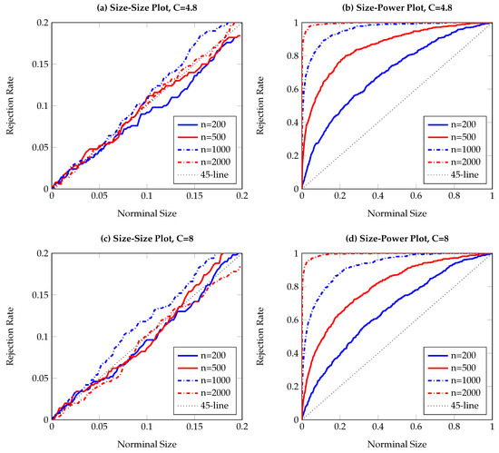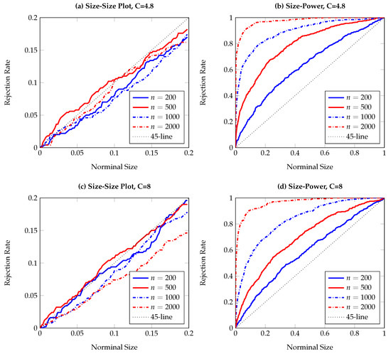 To visualize the simulation results, Figure 1, Figure 2, Figure 3, Figure 4, Figure 5, Figure 6, Figure 7, Figure 8, Figure 9 and Figure 10 report the empirical size and power against the nominal size. Since the performance of the five difference resampling methods is quite similar, we only show the results for (SMB.a) for simplicity. In each figure, the left (right) panels show the realized size (power), and we choose () for the top (bottom) two panels. We can see from the figures that the empirical performance of the TE test are overall satisfactory, apart for those (G)ARCH processes where a small C may lead to conservative testing size for large sample sizes (see Figure 3a, Figure 5a, Figure 6a and Figure 7a). The under-rejection problem is caused by the inappropriate choice , which makes the bandwidth for kernel estimation too small. The influence of an inappropriately small bandwidth can also be seen in Figure 5b and Figure 6b, where the test has limited power for the alternative.