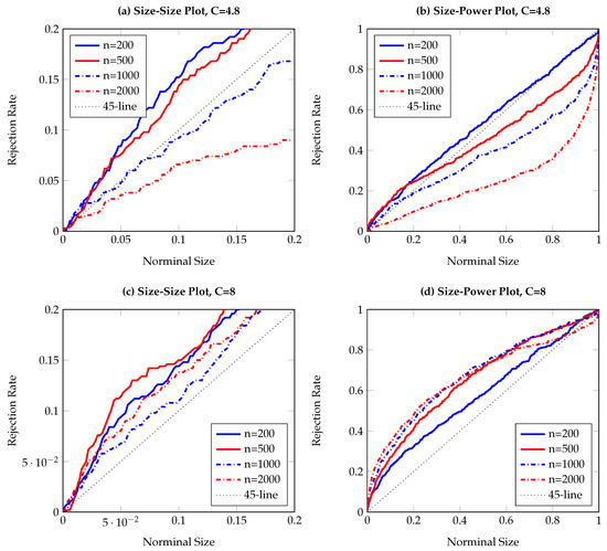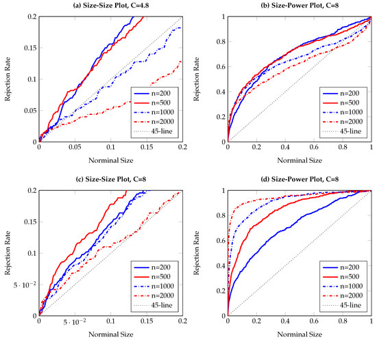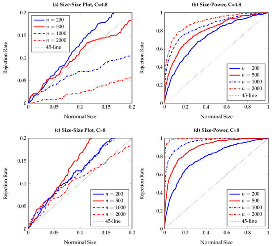 Size-size and size-power plots of Granger non-causality tests, based on 500 replications and smoothed local bootstrap (a). The DGP is the bivariate threshold AR(1) process in Equation (17), with Y affecting X. The left (right) column shows observed rejection rates under the null (alternative) hypothesis. The sample size varies from to .