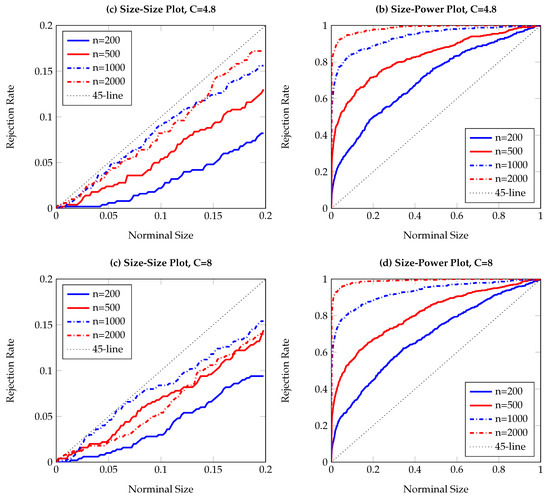 Finally, Table 10 presents the empirical power for the two-way VAR process, where the two variables and are inter-tangled with each other. Due to the setting and in Equation (18), it is obvious that is a stronger Granger cause for than the other way around. As a consequence, the reported rejection rates in Table 10 are overall higher when testing than .