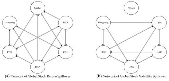 Based on Table 12 and Table 13, we may draw several conclusions. Firstly, the US index and German index are the most important return transmitters and Hong Kong is the largest source for volatility spillover, judged by the numbers of significant linkages. Note that this finding is similar as the result in [49], where the total return (volatility) spillovers from US (Hong Kong) to others are found to be much higher than from any other country. Figure 11 provides a graphical illustration of the global spillover network based on the result of (SMB.a) from Table 12 and Table 13. Apart from the main transmitters, we can clearly see that Nikkei and CAC are the main receivers in the global return spillover network, while DAX is the main receiver of global volatility transmission.