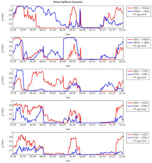 Finally, the dynamic plots provide additional insights into the sample period that the full sample analysis may omit. The DAX and CAC are found to be less relevant for future fluctuations in the weekly return of the DJIA, according to Table 12 and Figure 11. However, one can clearly see that since 2001, the p-values for DAX→DJIA and CAC→DJIA are consistently below 5% for most of the time, suggesting an increase of the integration of global financial markets.